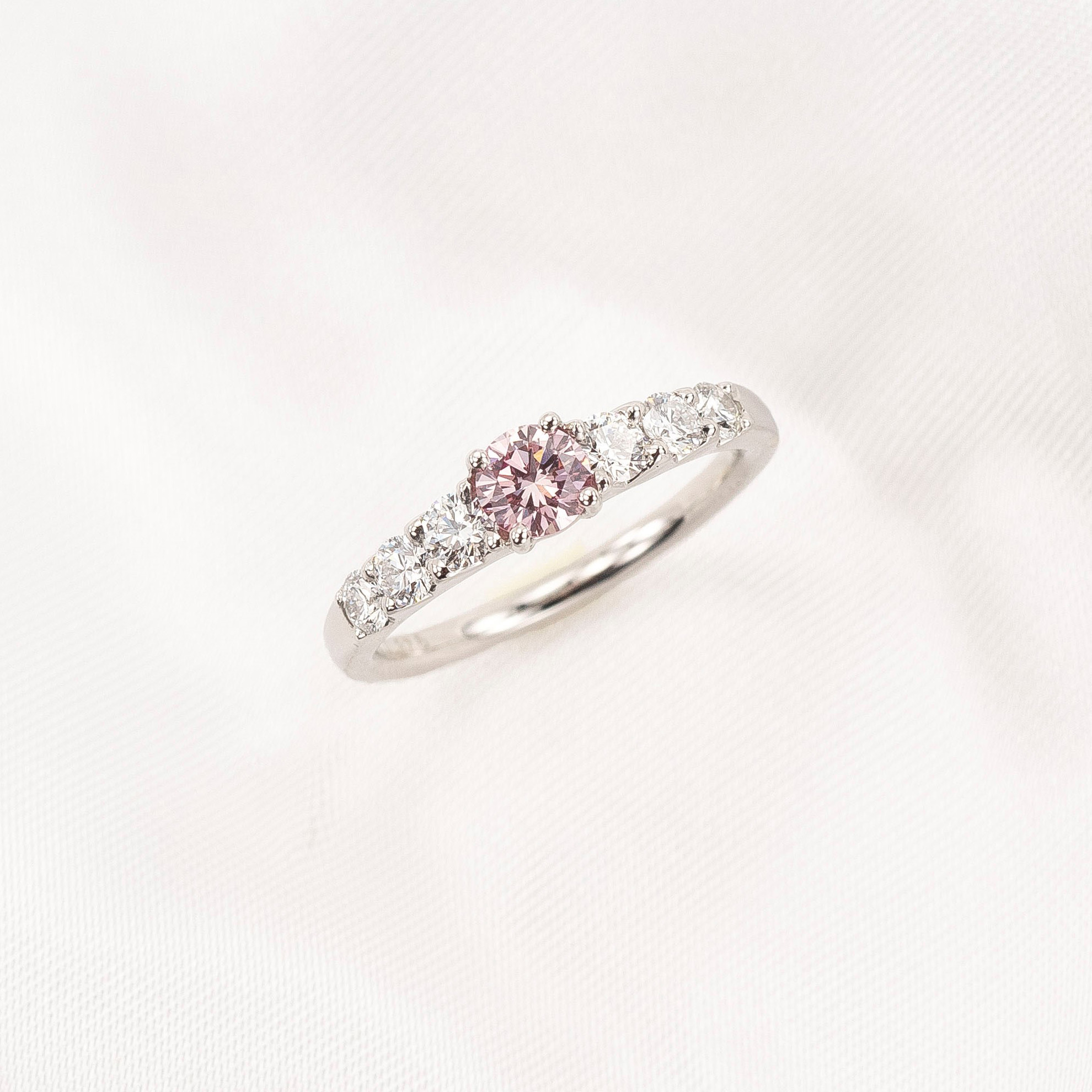 天然できれいなピンクを現すダイヤは「ファンシーピンク」と記されますが、光源よってピンクが濃くなったり薄くなるなど様々な表情が魅力です。0.376ct VVS1 脇石0.522ct Pt900 AGTラボ