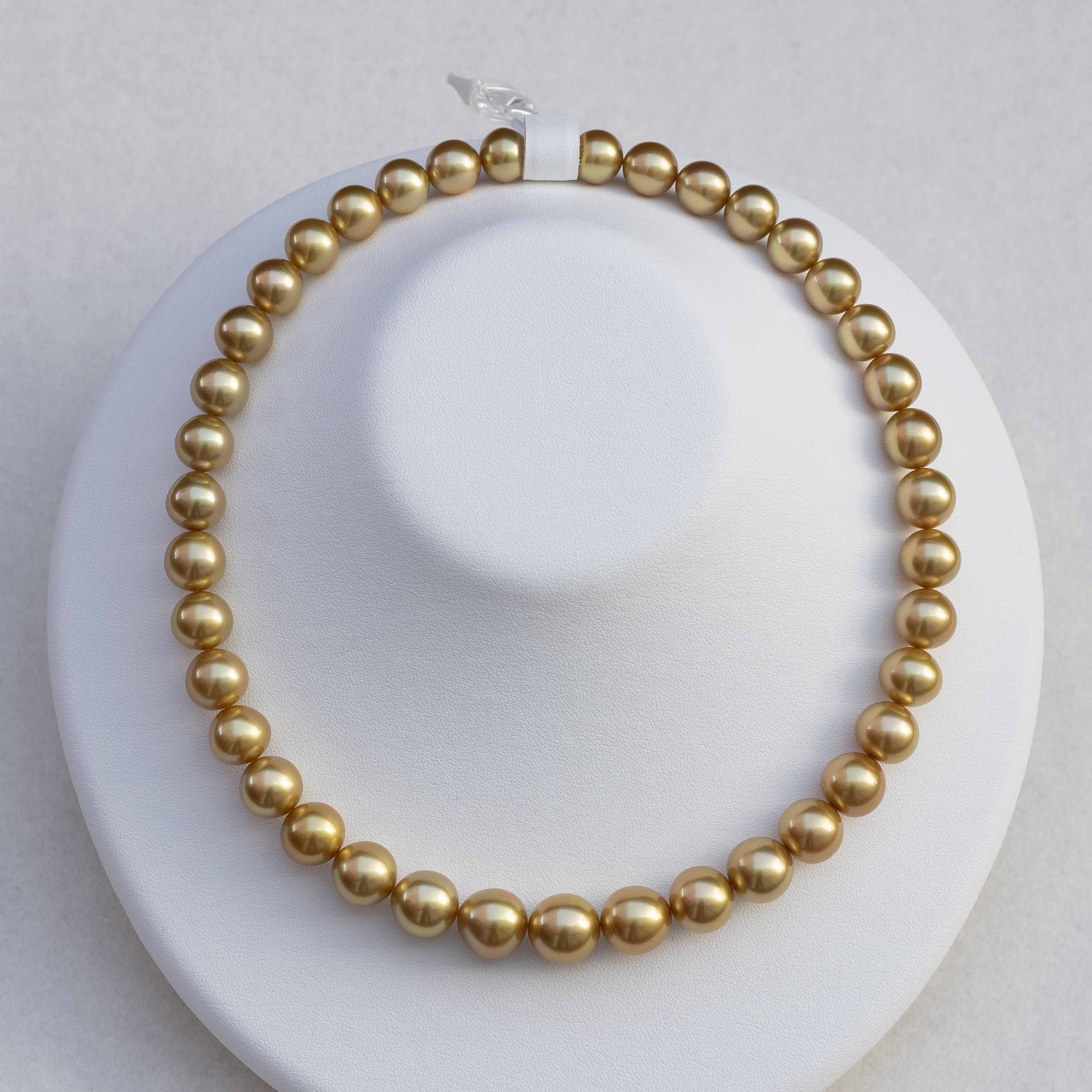 ゴールデンパールの中でも品良い赤味を帯びた美しい珠は「茶金」と呼ばれています。12.5-10mm 真珠総研Gold Lip花珠鑑別