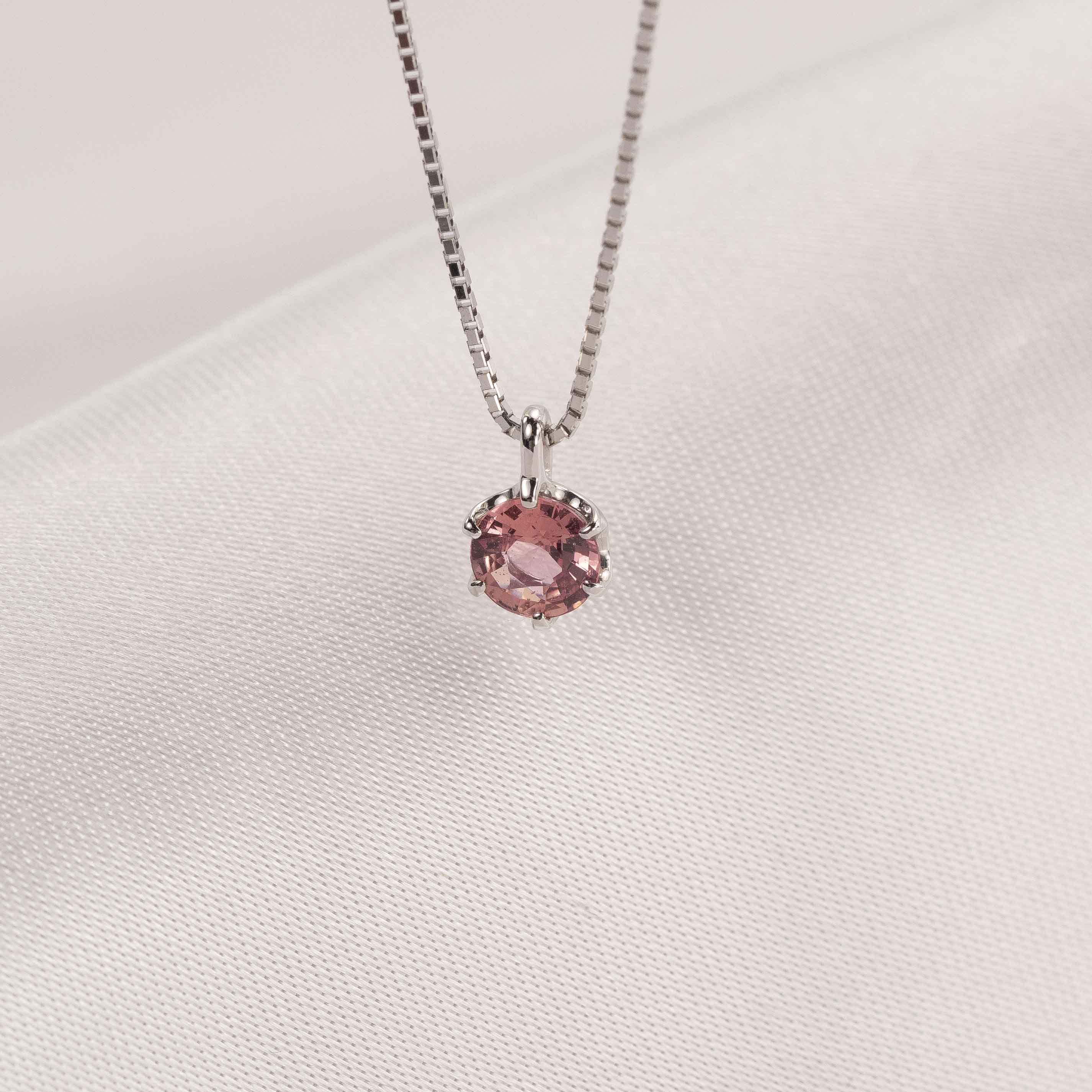 ピンクとオレンジが混ざった独特の色合いと小粒ながらもビビッドな輝きが魅力のプチネックレス。0.477ct Pt900、チェーンPt850 日独パパラチア鑑別